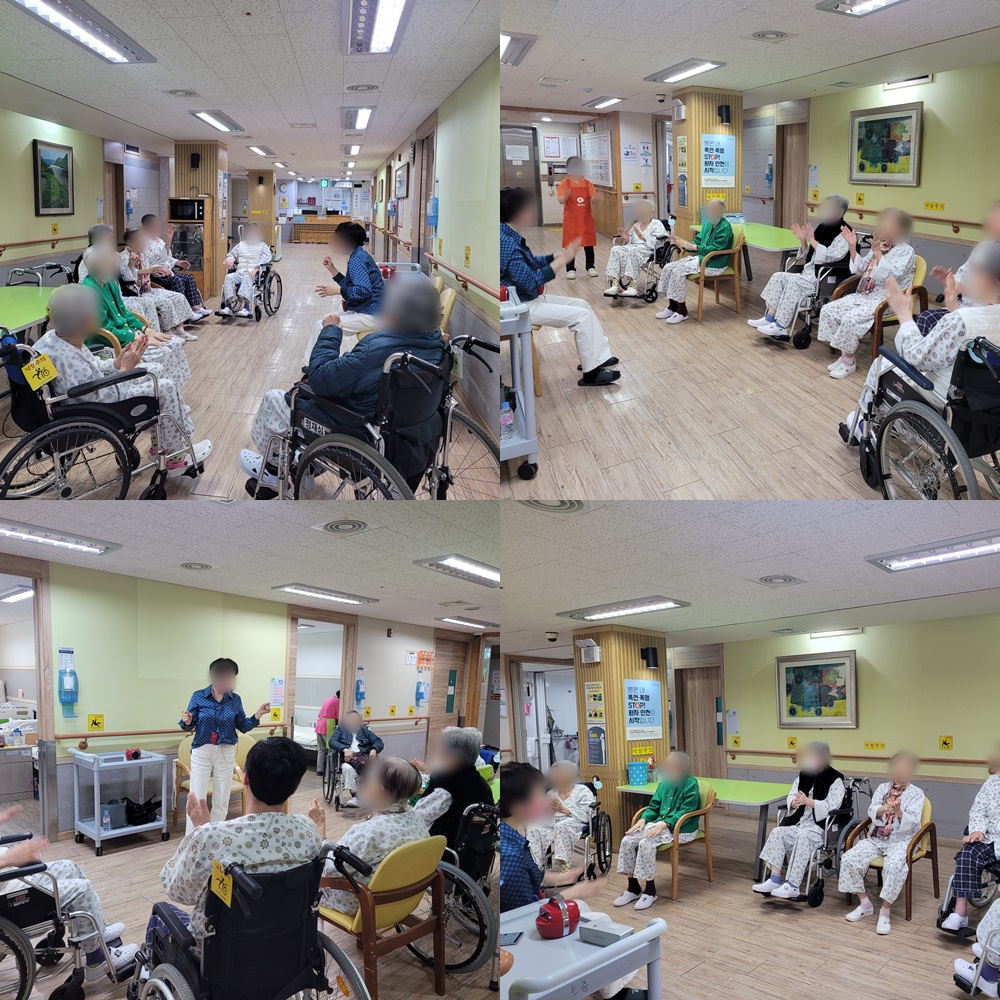 2023년 3월 웃음치료시간에는 3층 병동 어르신들과 함께 음악에 맞춰 율동, 노래하는 시간을 가져보았습니다. 평소 소극적인 어르신분들도 함께 "하하하" 웃으며, 적극적으로 율동하고 신나게 노래부르는 모습을 볼 수 있었습니다