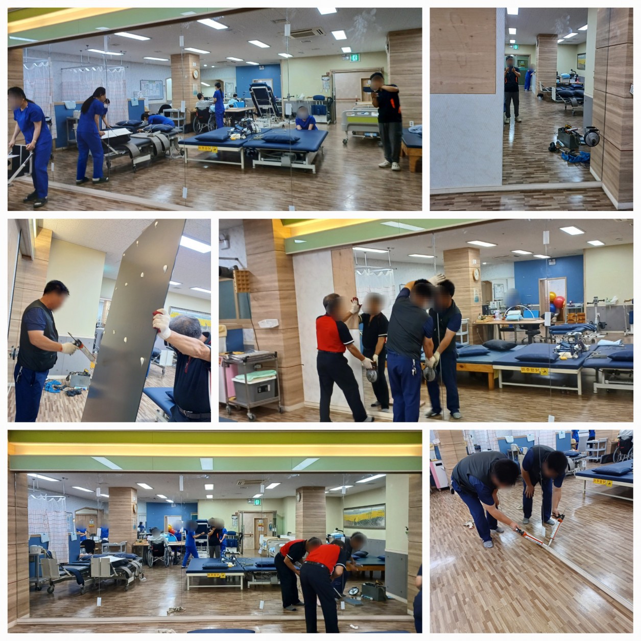 재활치료실 한쪽 벽면을 거울로 꾸미는