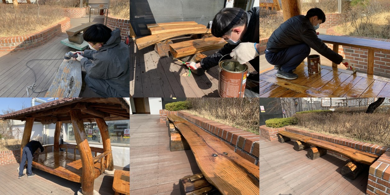정자와 나무 의자를 보수 작업